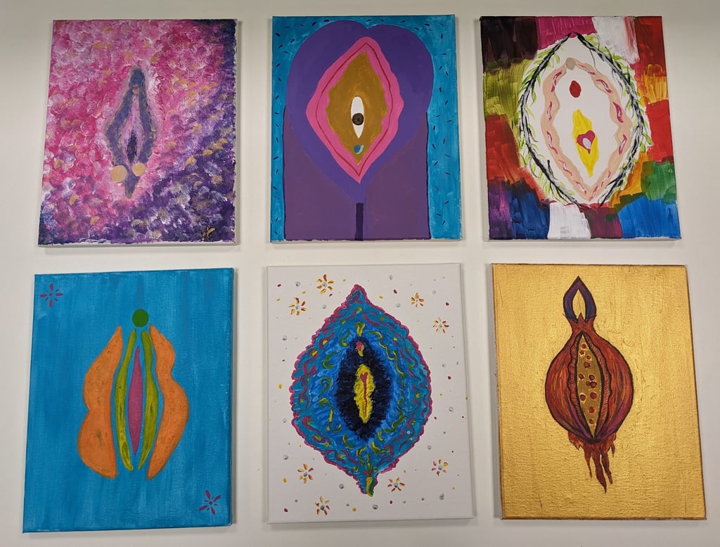 I scattered a variety of vulva paintings by different artists across the table to inspire participants.