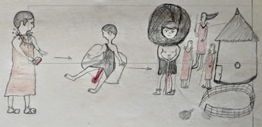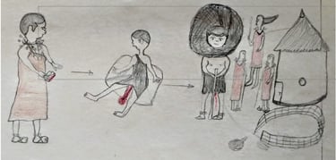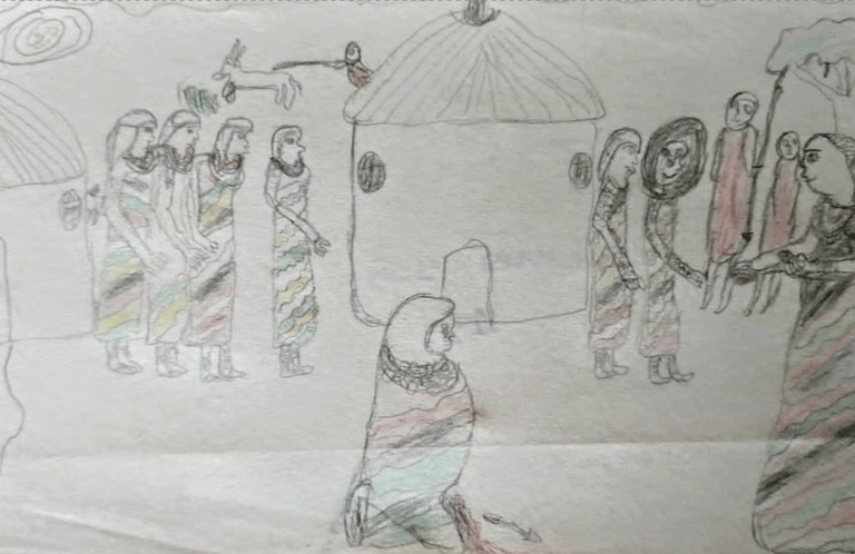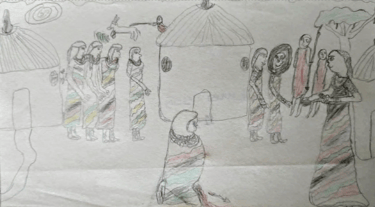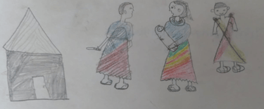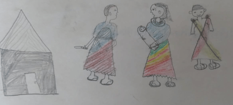 Therefore, in order to make sure to respect each participant’s boundaries, I invited each of them to draw what came to their minds when hearing the word “emurata” (circumcision in Maa). Their drawings, ranging from ceremonial elements (e.g. houses, ritual trees) to negative emotions (e.g. crying girls, hospitals), became the guiding thread for the resulting discussion: this helped make sure that participants could decide what they wanted to talk about, and helped weaken the risk of triggering their eventual traumas.